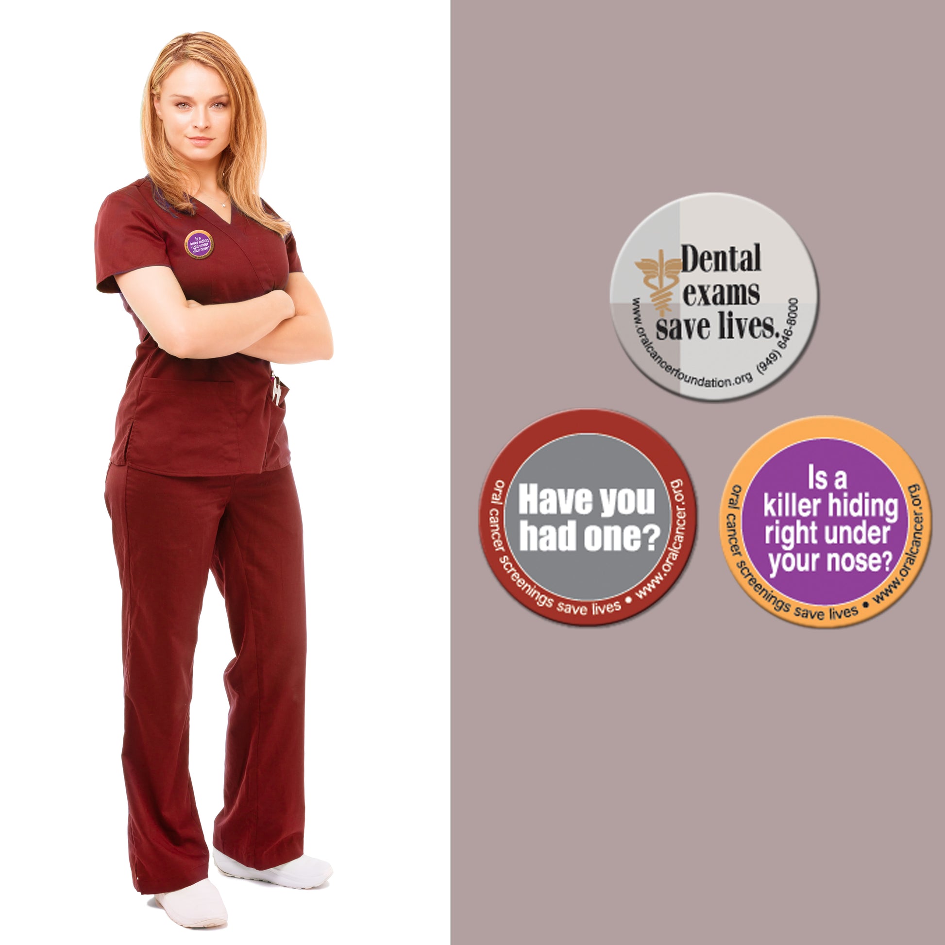 These buttons can be worn by everyone from medical and dental professionals to members of the public that would like spread the word about early detection and annual screenings. With sayings such as "Is a killer hiding right under your nose?" to "Dental Exams save lives" they are designed to raise a question in the mind of someone that sees you wearing one. The opportunity to tell the oral cancer and early detection saves lives story will present itself. Be an oral cancer activist and help spread the word about the dangers of the disease and the need for an annual screening.