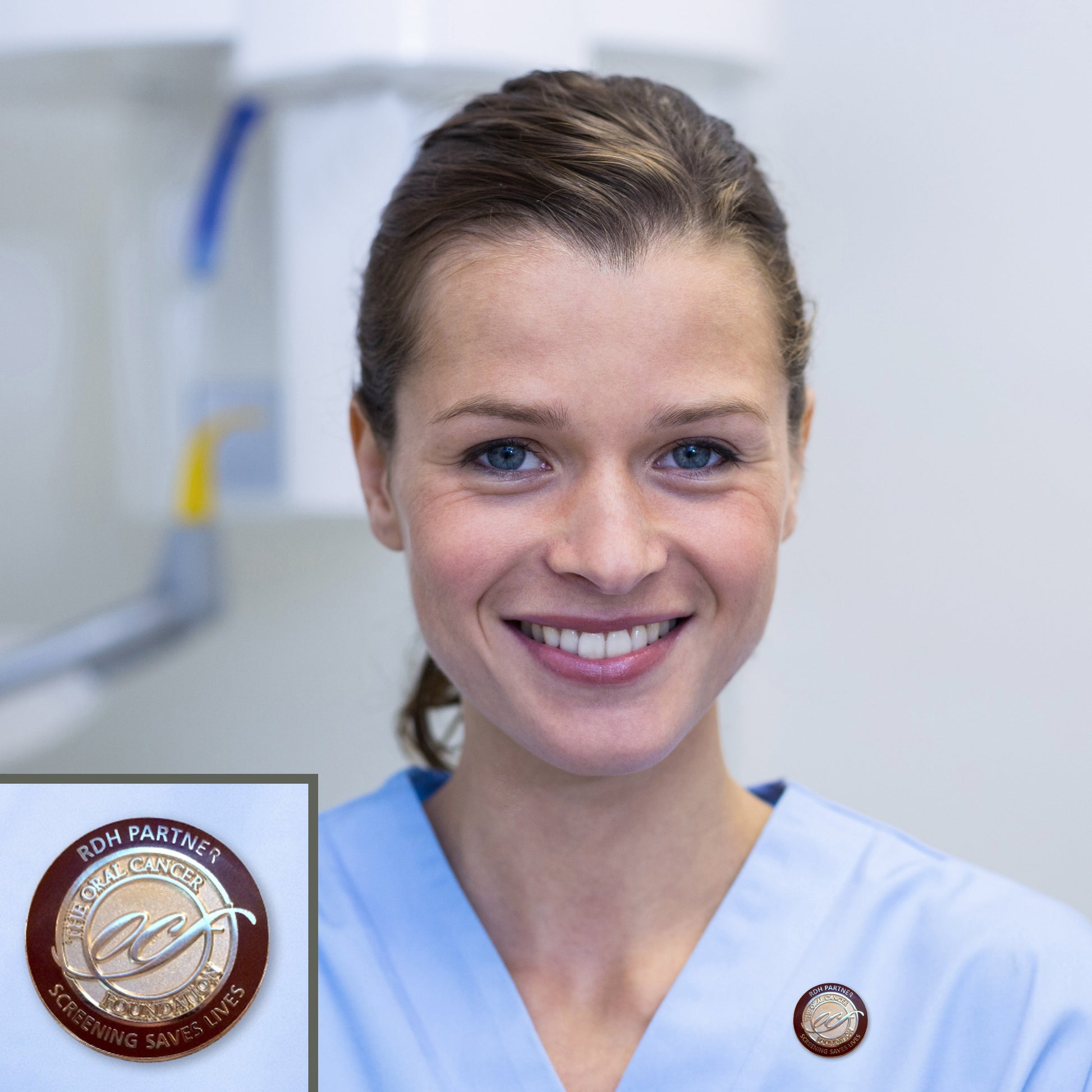 OCF has a strong relationship with the hygiene community, and we have hygienists as partners at all of our national screening events. Of course any RDH in the US who is actively engaged in oral cancer screening of their patients is really a partner in the OCF effort to find this disease early. If you would like to proudly show your patients that you are part of this important movement, this pin is for you. Made from polished cast metal with a burgundy cloisonné band around it. We sell these at our costs with no mark up or additional shipping charges.